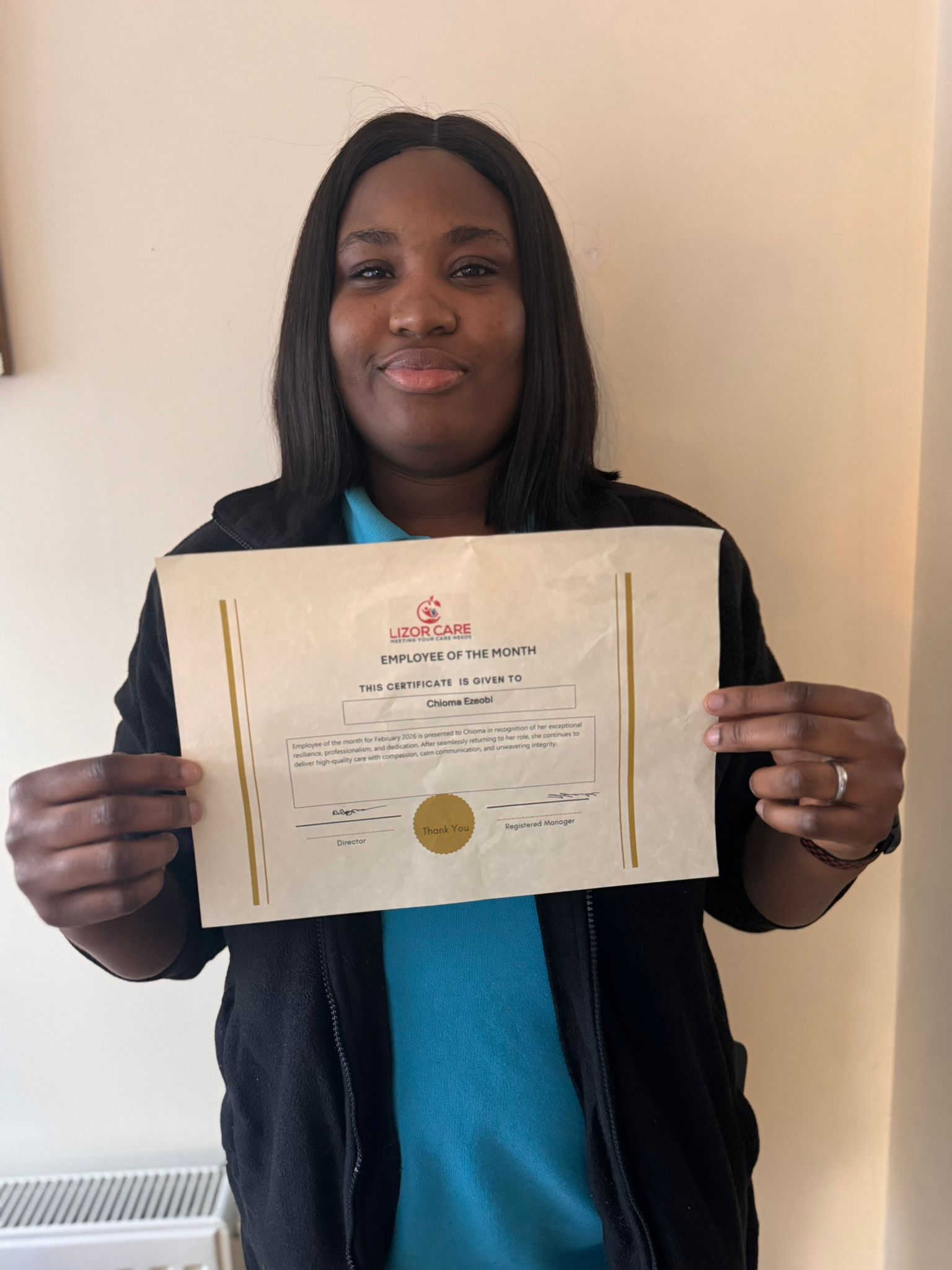 Employee of the month for February 2026 is presented to Chioma in recognition of her exceptional resilience, professionalism, and dedication. After seamlessly returning to her role, she continues to deliver high-quality care with compassion, calm communication, and unwavering integrity.